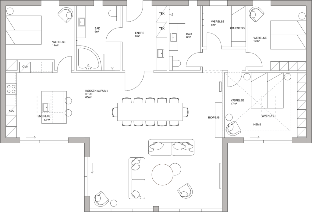Denne plantegning er designet til at imødekomme behovene for op til 10 personer, med rummelige soveværelser, moderne faciliteter og en åben stue, der inviterer til fællesskab. Udnyt det generøse udendørs område med stor terrasse, perfekt til grillaftener og afslapning. Skab varige minder i et sommerhus, der kombinerer komfort, funktionalitet og æstetik.